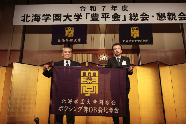 福原正己事務局長から会務報告が行われた後、出席された支部長全員が紹介され、新たに支部に加盟した「北海学園大学ボクシング部OB会北拳会」の倉田達夫会長へ関会長から支部旗が贈呈された後、城秀夫副会長の閉会宣言で総会は終了いたしました。