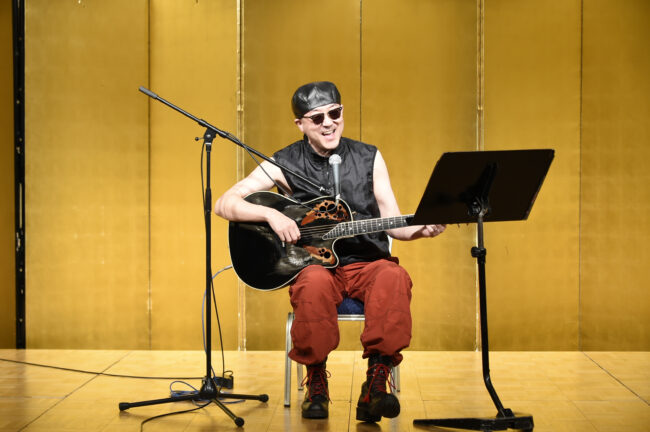 続いて平成3年法学部卒・フォークソング研究会出身の「スタディー小山」のライブが行われ、ロック調の見た目とは異なる穏やかな語りで会場の皆さんを魅了して頂きました。