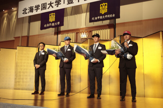 続いて懇親会が開催され、恩師、来賓の紹介後、10月23日に開催されたプロ野球ドラフト会議で指名された硬式野球部の工藤泰己さん(広島東洋カープ4位指名)、髙谷 舟さん(オリックス・バファローズ5位指名)、常谷拓輝さん(北海道日本ハムファイターズ育成1位指名)の3名に花束を贈呈し、島崎圭介監督から選手を紹介して頂いた後、3名に抱負を語って頂き、会場は大いに盛り上がりました。